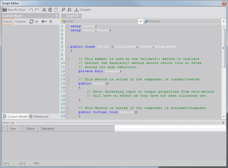 By double-clicking on a script node, the Script Editor is opened. The dock window on the left shows the input and output properties added to this node by the author of the script. By pressing the add button, new properties for float values, strings, methods and so on can be created. The dock window also contains a tab for showing the references to assemblies (i.e. DLLs) that can be used in the script.
