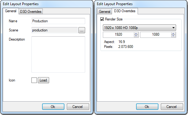 A very important feature of Layouts is the possibility to override the actual rendering and screen settings of the actual Ventuz project. In the D3D Overrides tab, a small check-box on every configuration group can be checked to specify new values for each particular Layout.
