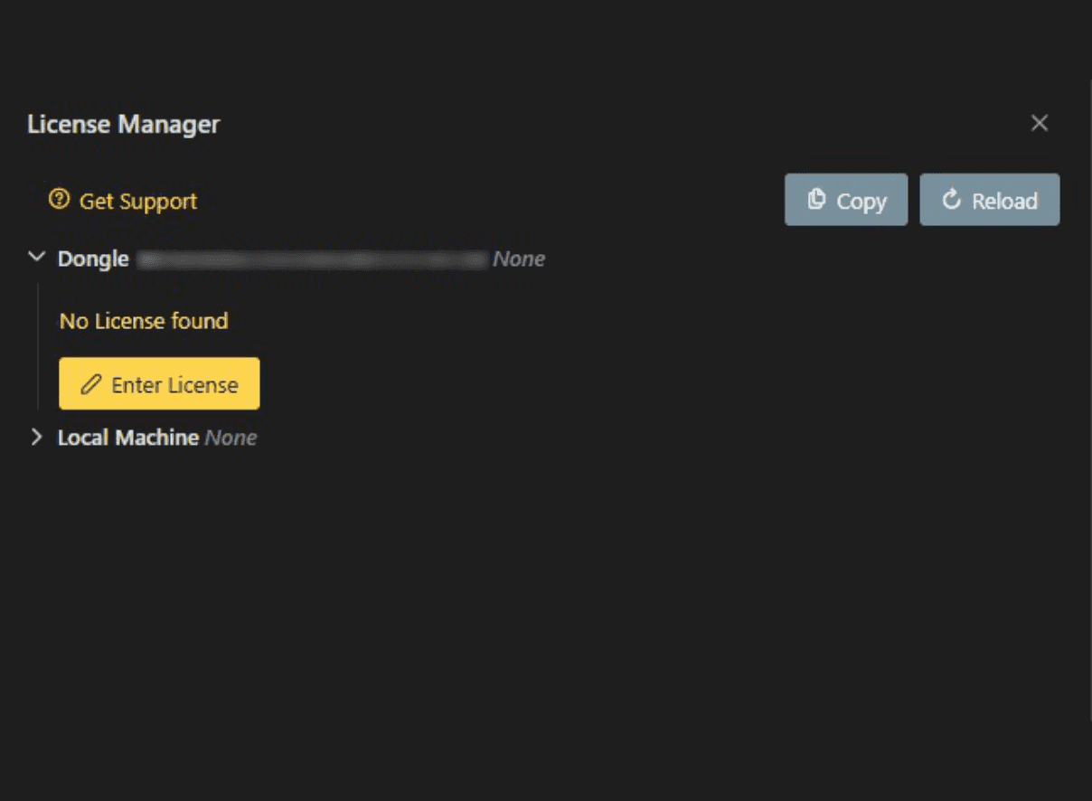 Click Enter license, the one closest to your dongle serial. Take care that you do not activate the license on the local machine by mistake. Enter your license label. Click Activate license