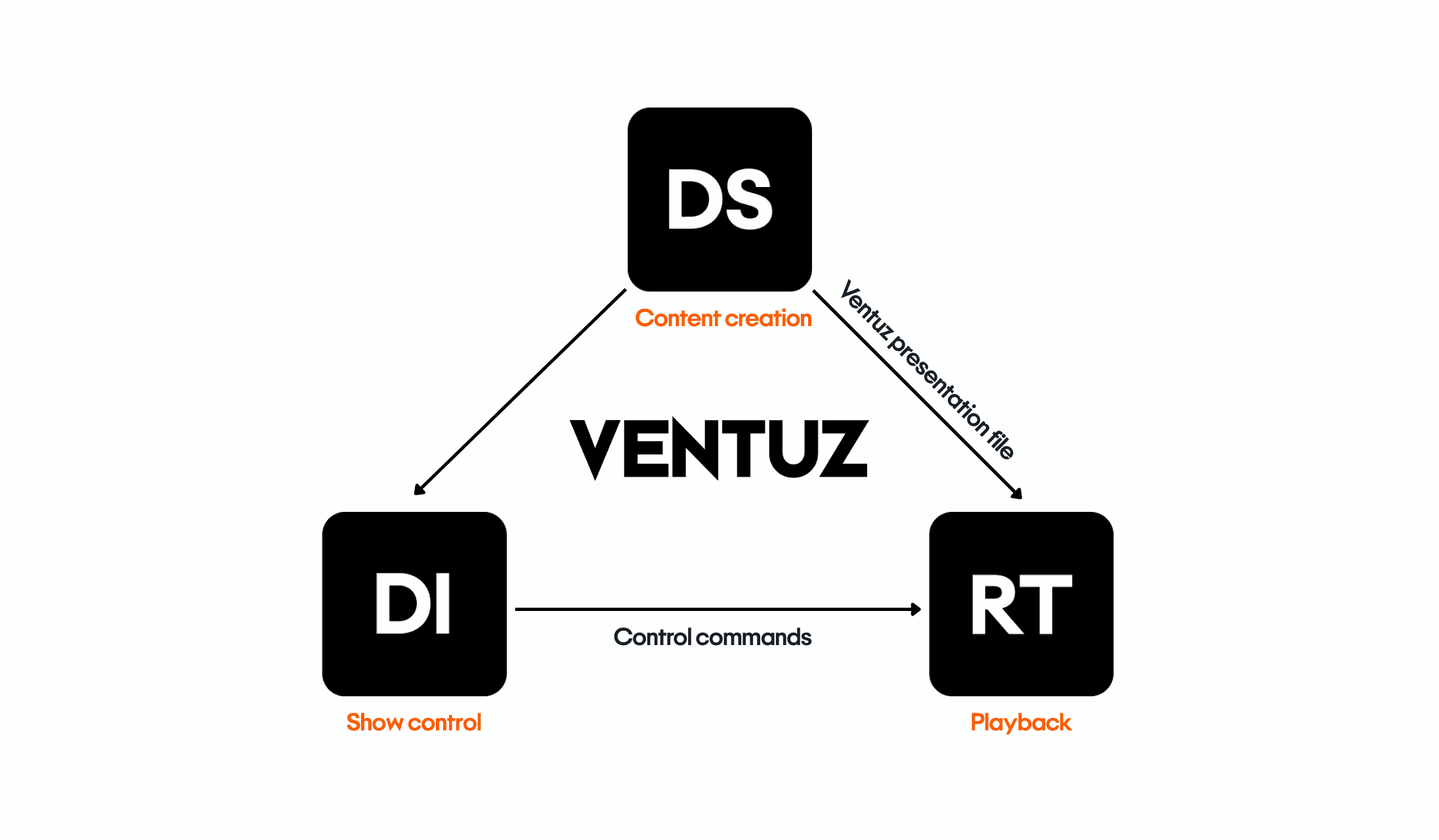 Ventuz offers 3 separate products to enhance your workflow: Ventuz Designer, Ventuz Director, Ventuz Runtime.