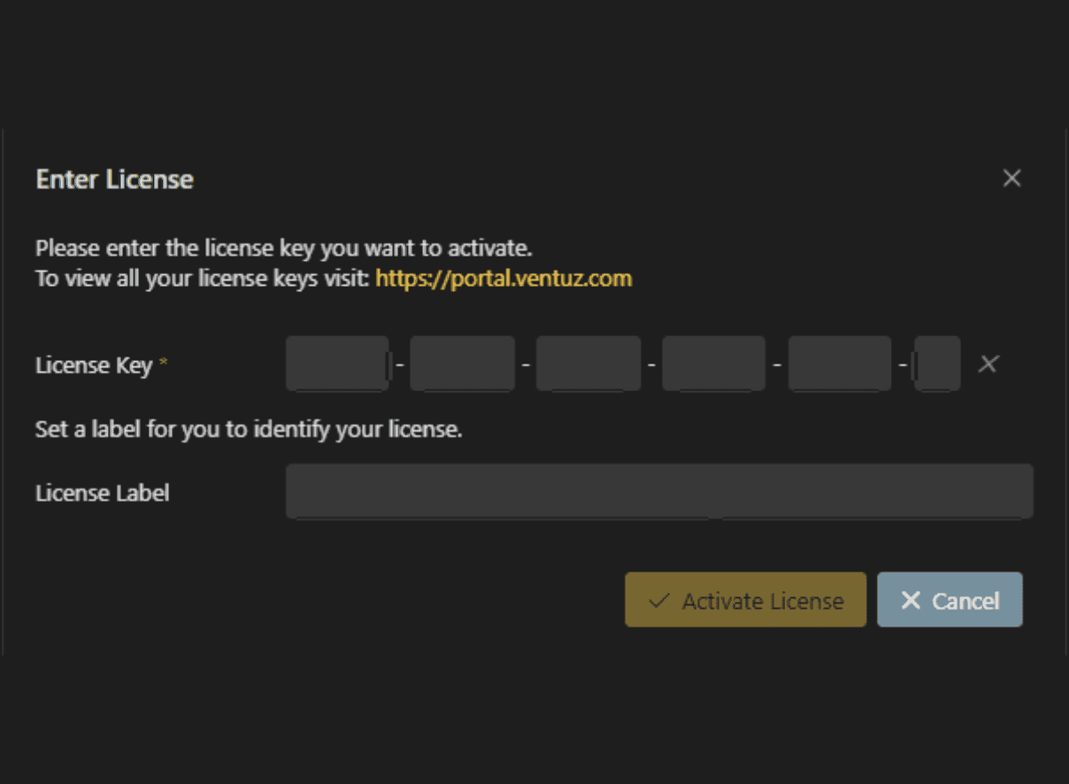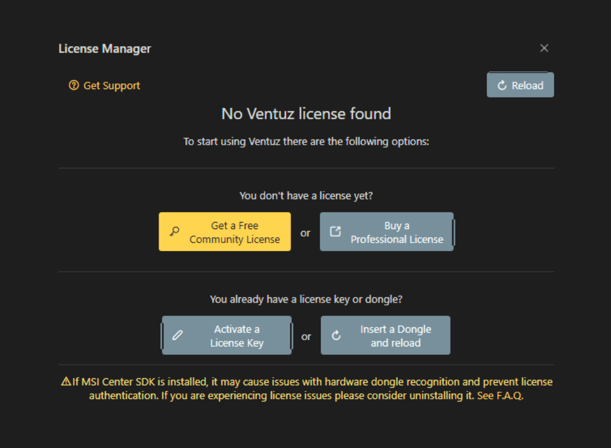 One the first start of the launcher the license manager will appear as an overlay, allowing you to either activate a license or obtain a new one.
