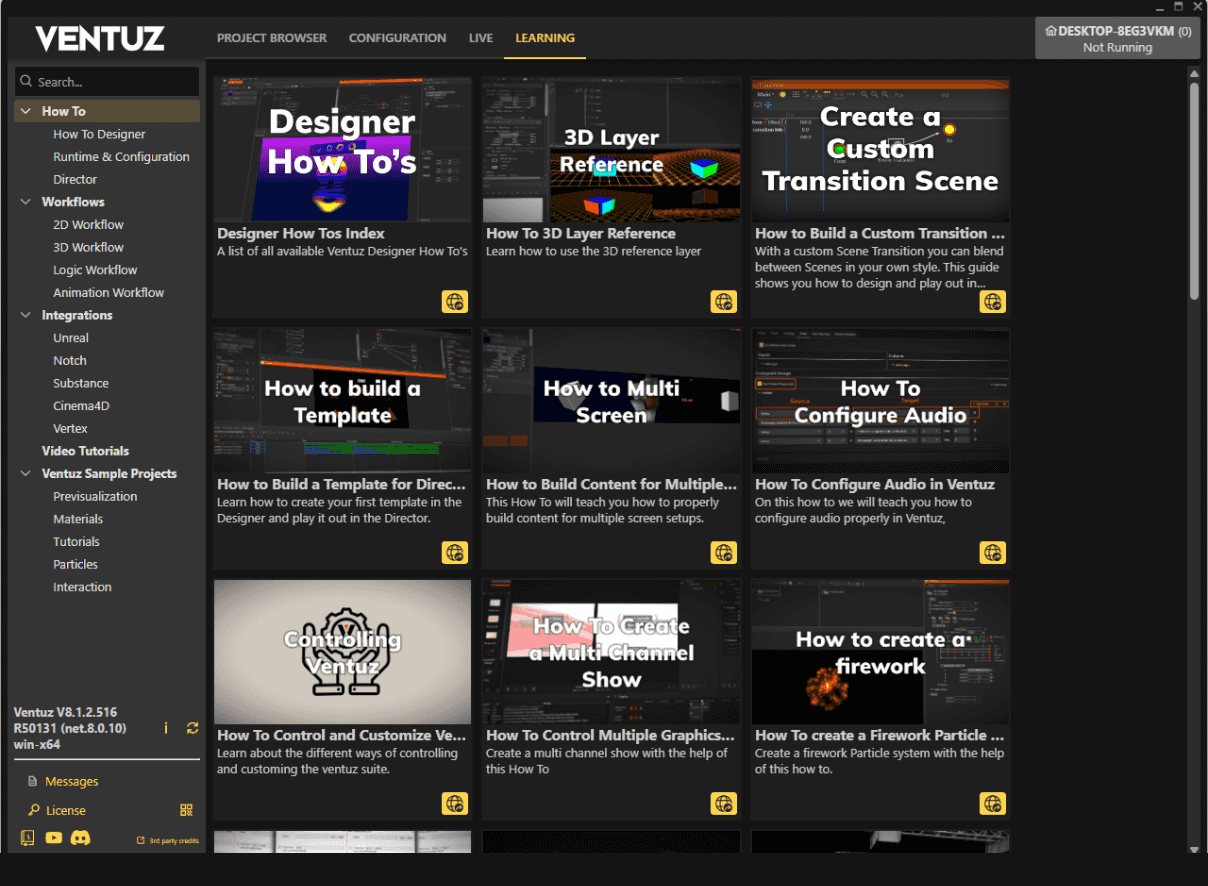 The Ventuz launcher is the starting point of your journey inside the Ventuz software suite. Here you can see your projects, configure your machines, and find learning resources – from the Ventuz user manual or video tutorial series. Find the launcher in your Windows start menu and start it.