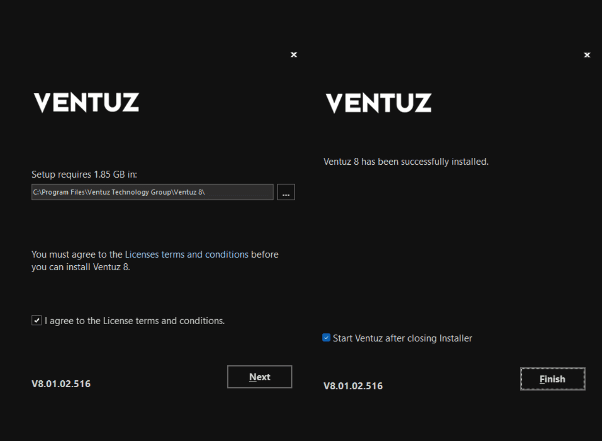 After launching the Ventuz installer, a dialog box will appear. Review and accept the License Terms and Conditions, then click Next to continue. Follow the on-screen instructions to complete the installation process.