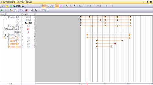 The right area shows the timeline for the animation and where the keyframes for each property are set. By clicking left mouse button into this area, the current time (represented by a red vertical line) can be changed and as long as the left button remains pressed, the animated property will have the value defined at that point in time of the animation instead of the following the global time of the animation. By dragging left and right left mouse button, the user can scrub through the animation. The current value at the time, the red line is set to, is shown in the column between the tree hierarchy and the timeline.