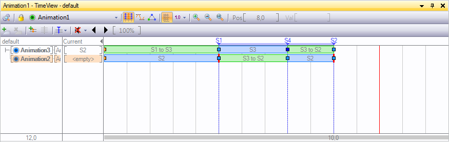 Held States are marked in blue and State Connections are marked in green. If State Connections have been selected and the embedded animation logic does not define them in a fluid rundown, a jump in the animation will occur. These breaks in an embedded animation do not necessarily have to be an error and can be used nevertheless. These breaks are marked with a red bar at the corresponding keyframe.