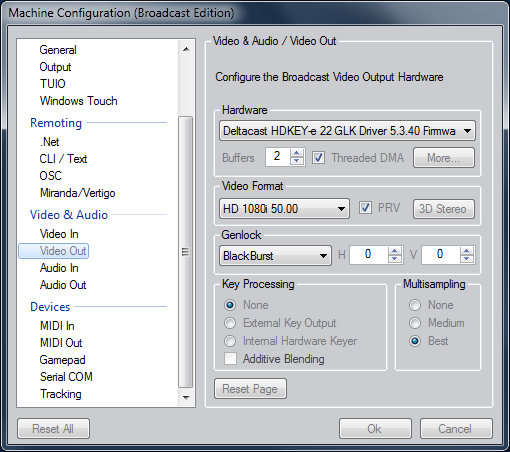 The Broadcast Video Output settings are only available in the Ventuz Broadcast Edition. They configure the video format of input and output signals as well as key processing and rendering quality. Additional hardware specific settings are also available.