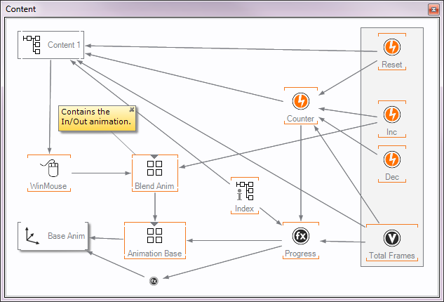 As opposed to the Hierarchy Editor, the Content Editor visualizes its content as a network of nodes rather than a hierarchy. There is no defined order in which information travels along the bindings. Instead, the validation mechanism inside Ventuz ensures that all nodes are correctly updated before rendering starts.