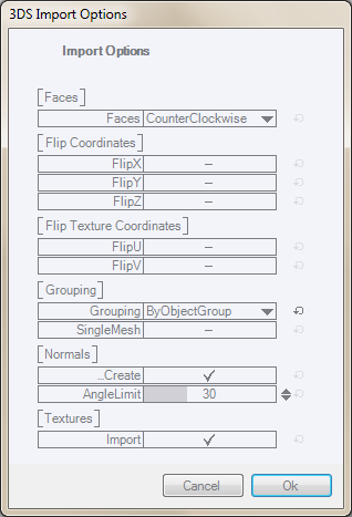 The Import Options Dialog for the 3DS format looks as follows. It is very similar to the dialogs of the OBJ and RTG import.