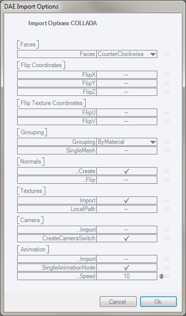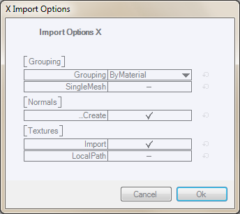 Unlike the three previous formats, the X format has only few options. This is because Ventuz uses the DirectX API to load X files. It does not parse them on its own like the other formats. This avoids the access to some low-level options. The effects of the existing options are described in the 3DS and RTG sections.