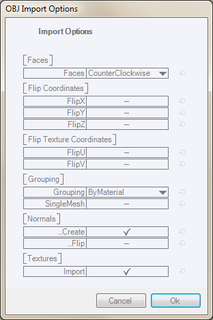 The category Normals consists of two options. The option Create is described in the 3DS section. Unlike 3DS the OBJ format is able to store vertex normals. But not every OBJ file must necessarily have vertex normals. If the Create option is enabled normals will only be created by Ventuz if the file does not provide any. Enabling the Flip option will turn the original normal vectors by 180°. As mentioned in the Common Import Options section, the visibility of a face or polygon depends on the vertex order that is controlled by the Faces option. But additionally the visibility depends on a correct normal vector direction. If you import geometry but can't see anything in the render output this can have two reasons. The first reason can be a wrong vertex order. The second, additional reason can be a wrong normal direction. Just try the import with different combinations of the Faces and Normals Flip options until you get a correct result in the render window.