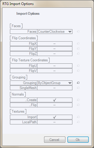 The options are the same as for the 3DS or OBJ import. The only difference is an additional option in the category Textures. The LocalPath option is used to change the location where Ventuz looks for geometry textures if they should be imported into a Ventuz project. The RTG format stores the full path to required textures. But if you move the RTG file and textures to a different location, Ventuz can search the folder that contains the RTG file, provided that the LocalPath option is enabled.
