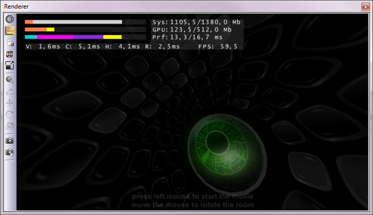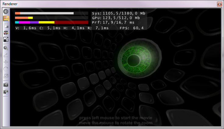 The lowest bar Prf displays the times needed for scene validation and rendering and thus gives you information about the performance of the scene. This bar consists of four segments. The turquoise segment represents the time per frame needed for the video frame transfer of all running movies/live videos in the active scene (the V-value). This does not apply to Quicktime movies as the decoding is done in the following node validation. The magenta bar segment corresponds to the time needed for validation of nodes (mostly the Content nodes) which have been invalidated through bound property values (the C-value). The time needed to traverse and validate the Hierarchy tree is represented in the violet segment (the H-value). The yellow segment represents the time needed by the graphics card to render the scene (the R-value). The values right to the bar display the sum of all four values and the available time per frame (depends on refresh rate) in milliseconds. The text line below displays the four performance values and the current frame rate. These are average values which are updated every second.