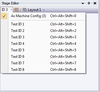Inside the Stage Editor one can switch the Layout to be used by the current project (see below) as well as temporarily change the !MachineID for the local machine in order to test cluster setups. Both features are also accessible via keyboard shortcuts.