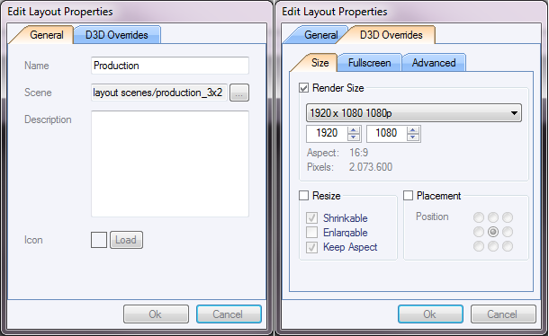 A very important feature of Layouts is the possibility to override the actual rendering and screen settings of the actual Ventuz project. In the D3D Overrides tab, a small check-box on every configuration group can be checked to specify new values for each particular Layout.