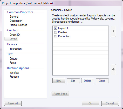 The configuration of Layouts is done in the Project Properties. The Layout section in the Project Properties dialog provides possibilities to create and edit Layouts.