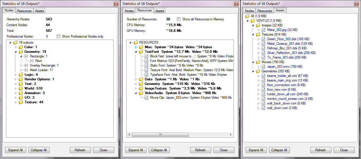 The Scene Statistics dialog provides information about the nodes and their occurrence that have been used in the scene. It shows which scene components and resources use how much memory space. Additionally all assets that are used in the open Ventuz scenes are listed.