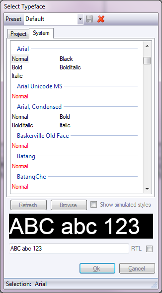 The Typeface Editor manages all fonts and font presets in a project. The editor consists of two font browsers, one for Project fonts and one for System fonts. The latter are fonts which are installed on the local machine. The browser lists all fonts alphabetically. Default/Standard fonts which are present on every new Windows 7 installation are displayed in black. All other fonts are marked red.