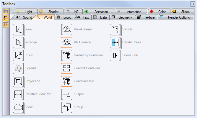 The Toolbox contains all the Nodes that ship with Ventuz. Each node is either a Hierarchy Node (brackets to the left and right of the icon) or a Content Node (brackets at the top and bottom of the icon) and belongs to exactly one category (i.e. World, Interaction, ...). Some of the entries shown in the Toolbox represent more than one node which is visualized by lines to the lower right that represent a stack underneath the icon. click