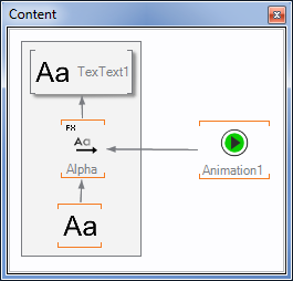 Let's make the text appear and disappear when fading in/out a slide. Select the Texture Text and drag a Text Effects node from the Toolbox to the Content Editor. Drag it over the connection line between the Block Text and the Texture Text node until the connection line is drawn completely black instead of the usual dark grey. Dropping it now will insert the new node between the two connected nodes and automatically adjust all bindings. Choose Alpha Effect from the popup. We are going to animate the Progress property of this Alpha Effect node. Drag a Keyframe Animation node from the Toolbox to the Hierarchy Editor while inside a Slide. Re-select the Alpha Effect node and bind the Progress property to the animation.