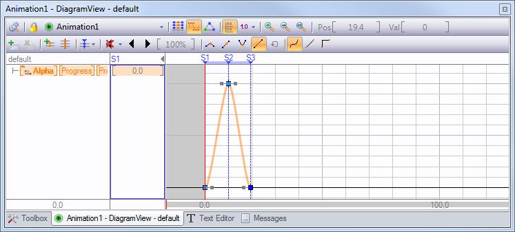 Head over to the Animation Editor by choosing View/Animation Editor from the main application menu bar. In the left column, an Animation Channel for the Alpha Progress has already been created. Select it by