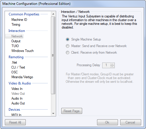If Single Machine Setup is selected, the event atoms will directly be handed over from the hardware devices to the virtual devices and no network traffic is involved. When a Ventuz scene is running on a cluster of machines, all input devices that are used in the scene should be connected to one machine, the Master. Selecting master in the configuration will cause this machine to serialize the atoms to network packages instead of passing them to the virtual devices by memory. All Client machines on the other hand will ignore all hardware input devices connected to them in the sense that their input will not be received by the respective Ventuz nodes. Instead, they open a network port and list to information coming from the Master machine.