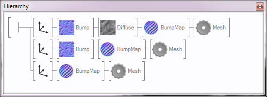 The BumpMap shader will use the Texture assigned to the first texture stage as its normal map. The easiest way to achieve this is by ensuring there is no Texture Node before the one that assigns the normal map. Additionally, all textures must be placed before the Shader node in the Tree Hierarchy! If no BumpMap texture is present, an internal default texture is used. The following hierarchy shows different valid combinations: