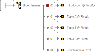 Much like Outputs in a Hierarchy Container, the Slide Manager uses Pivot nodes as connections between the nodes inside of it and the Slides. A pivot represents a location and orientation in the scene where a slide can be shown. When a slide is presented, its complete 3D content will be rendered at the position in the scene. Having multiple pivots can be used to present a group of slides at a different location and then fly back and forth from the main track to this topic group with the camera.