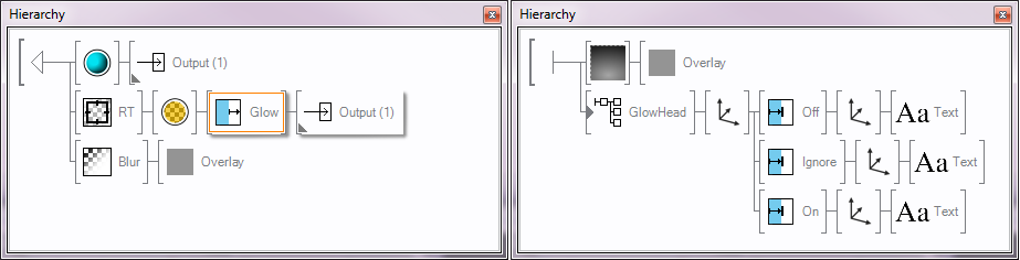 A possible scene setup for such a multi pass rendering is shown in the figure below. The GlowHead container has two linked Outputs: one for the normal pass and one for the glow pass. The normal 'blue' pass is traversed if the Filter Pass node is set to Off or Ignore. The 'yellow' glow pass is traversed if the Filter Pass node is set to On or Ignore.