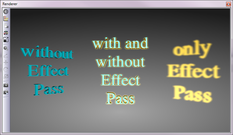 In the screen-shot below a glow effect was assigned to text objects. The glow is rendered in a separate render pass. Depending on the settings of the Filter Pass node only text, only glow or both, text and glow, are rendered.