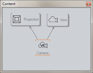 The VR Camera content nodes provides a simple way of generating a view and projection matrix based on common values gathered from camera tracking systems used in virtual studios. A real camera has a position and an orientation in the studio (view matrix) as well optical parameters expressed by the lens, such as zoom, focus and center shift (projection matrix).