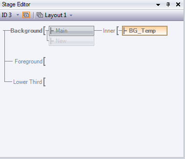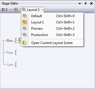 Inside the Stage Editor one can switch the Layout to be used by the current project (see below) as well as temporarily change the !MachineID for the local machine in order to test cluster setups. Both features are also accessible via keyboard shortcuts.
