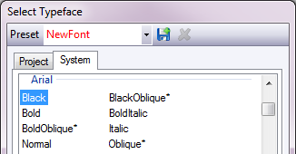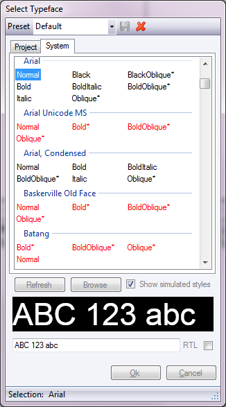 The Typeface Editor manages all fonts and font presets in a project. The editor consists of two font browsers, one for Project fonts and one for System fonts. The latter are fonts which are installed on the local machine. The browser lists all fonts alphabetically. Default/Standard fonts which are present on every new Windows 7 installation are displayed in black. All other fonts are marked red.