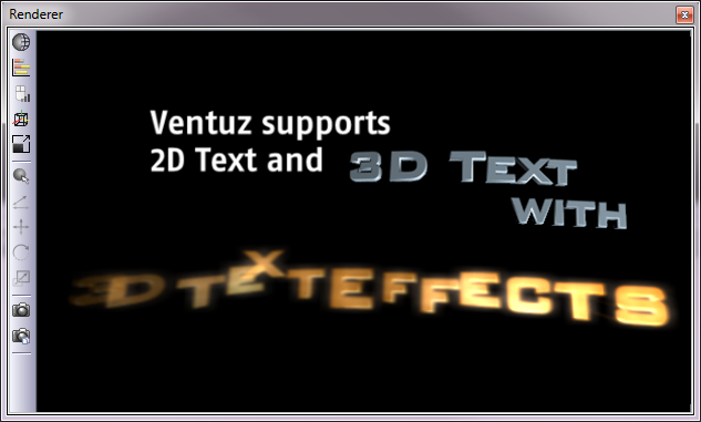 Ventuz provides a wide range of text effects and rendering styles. The modular structure of Ventuz offers the possibility to combine different effects and styles, resulting in virtually countless possibilities of displaying and animating text. The following sections shows the Project-specific font handling. The description of the text-related nodes can be found in the Nodes section.