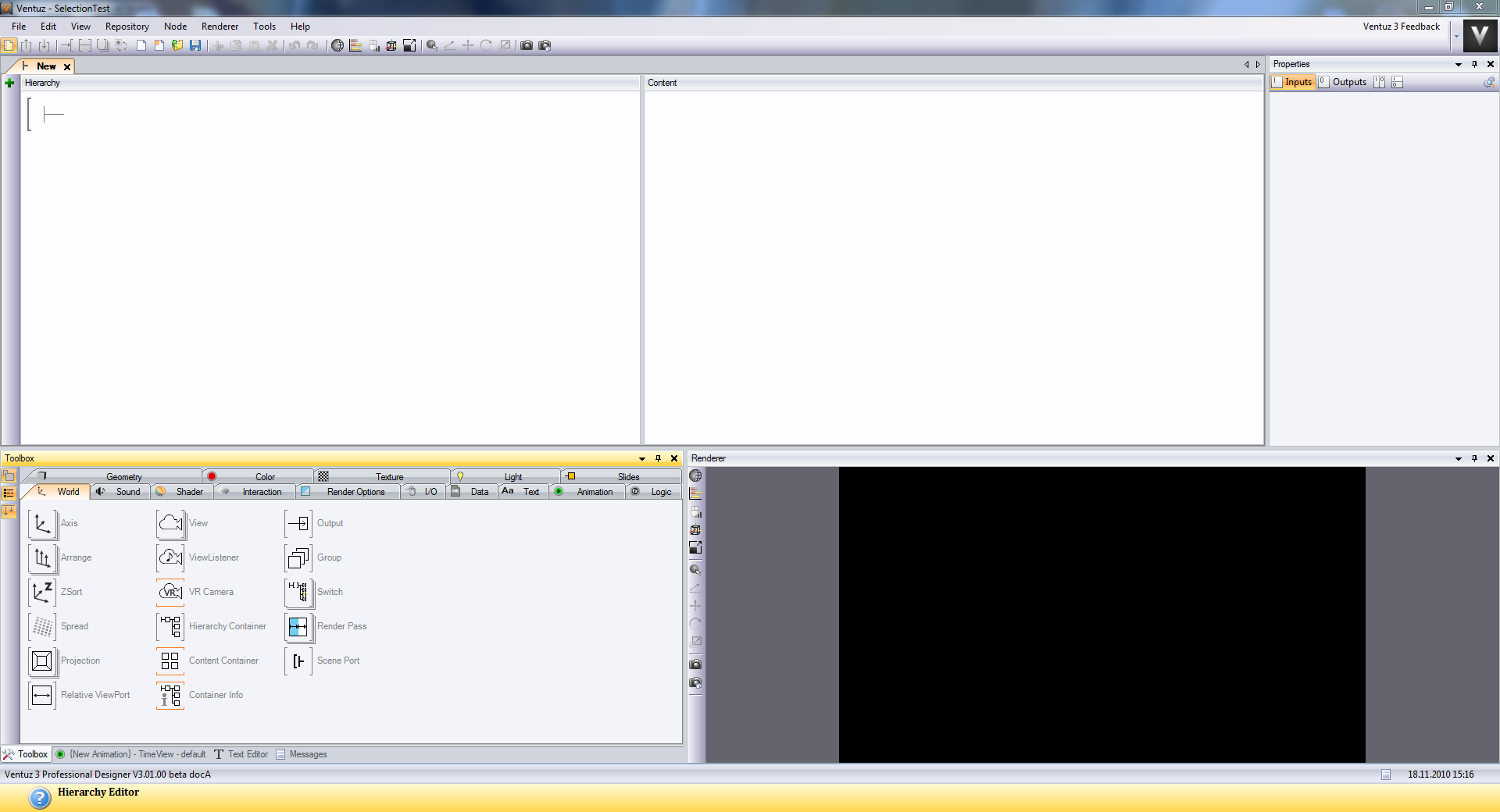 When launching Ventuz and either having created a new or opened an existing project, the graphical user interface will look something like the following. Please note that the application might look slightly different on your machine due to the Color Scheme set under Tools/Options/Layout/Color Scheme. Also the size and position of the various docking windows can be adjusted by the user. One can reset the layout in the menu under View/Layout/Reset Layout or re-open one of the docking windows under View if it has been closed.