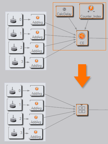In both cases, Container Nodes improve productivity as they enable the author to combine nodes to a new customized type of node. Picking up on the UI button example above, a button may require a geometry, multiple textures, keyframe animations and much more. All of those nodes can be put into one container, thus having the container act as a single node representing the button. The individual nodes are hidden from the main hierarchy level making the scene easier to understand and instead of duplicating the subtree, only the "button node" needs to be duplicated.
