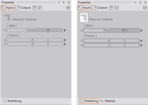 Interfaces are an extension of the Container idea to address the above, and other, problems. They define which properties a Container has to provide in order to be used in a certain part of the scene. A Container Interface keeps its properties (and therefore its bindings as well) intact even when the encapsulated nodes are removed. When the content of a container is replaced, new exposings can fulfill the interface properties.