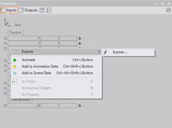 on the name of the property in the Property Editor and choose Expose/Edit... from the appearing context menu. The name and category of the property as it will appear on the Container can either be kept the same as on the original node or be reassigned in the dialog that opens. Press OK and the square to the left of the property name will change to green, symbolizing that this is now an exposed property. Note that exposed property names have to be unique within a container. Exposing two properties with the same name will not only confuse other Ventuz operators but can also disrupt the binding logic.