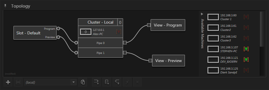Topologies are usually created by the IT department in advance when the rendering machines are set up, along the lines of creating a proper render setup for a cluster or making sure the group IDs match. A Ventuz Director operator typically only selects the correct topology to run his shown on and uses the Topology Editor to monitor the environment.