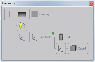 1. Drag left mouse button an Axis Node from the Toolbox to the Hierarchy Editor and let it drop anywhere else than on the two existing nodes. The Axis should appear on the top most level (i.e. under the Texture Node). Double click left mouse button on the Axis and type "Turntable" to give it a name for easy reference.