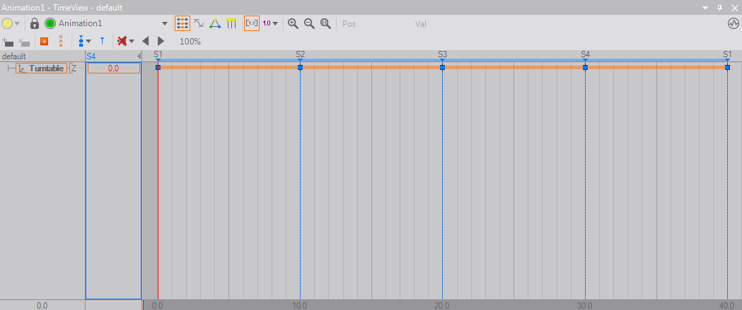 S2 to S4 are the remains of our old animation. Make sure the keyframe still say 90, 180 and 270. Then start with S1 to S2 by switching to that tab. You will notice that S1 no longer has a keyframe. So make sure the Animation Channel is still selected, move the red line to S1 and press the "add keyframe" button (two orange dots with a plus sign). Change the value of the new keyframe to 0. Go to "S4 to S1", do the same for S1 here and set the value to 360.