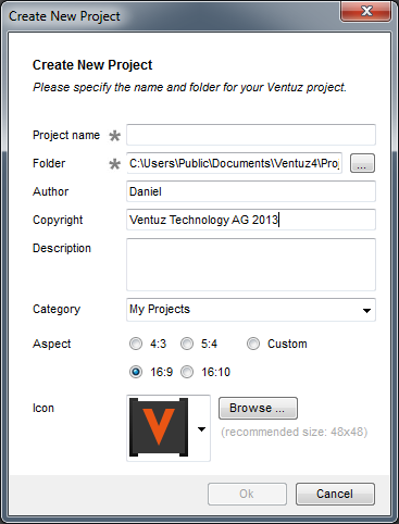 A project stores global information about the project like Project name, Folder , Aspect Ration and do forth. Fill out the fields and press Ok to create the project.