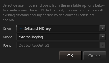 Video output streams are added by dragging a device from into the Outputs window. When doing so, a dialog pops up that allows users to specify some options: