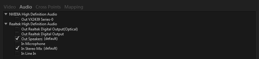 In the Audio section displays all pure audio devices available in the system along with their supported streams (input and/or output). Simply selected the streams you want to use. The default Windows input and output streams are marked with the text (Default).