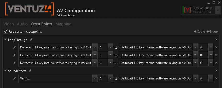 By default the Use custom crosspoints check box is unchecked. In that case Ventuz automatically subsequently connects the first stereo pair of all configured audio and video stream to the Ventuz Record Pairs. And all available audio outputs on all audio and video streams to the Ventuz Playback Pairs. All automatic cables are grouped is a single cable-group called Default. If the Use custom crosspoints is checked that cables have to created manually.
