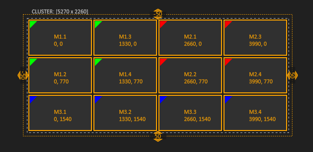 The machines and displays in the Render Setup Editor lie in a pixel-based coordinate space. The origin of this coordinate space is the top-left corner of the cluster bounding-box. The cluster bounding-box is the smallest bounding-box containing all machines. The X coordinate advances to the right; the Y coordinate to the bottom. Note that even if you move the whole cluster configuration to other coordinates than [0;0], it is reseted to [0;0] before it is saved to file. The position of the whole cluster does not affect the render output of Ventuz with the according Render Setup configuration