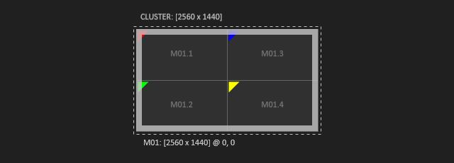 The logical resolution of a machine is defined by the Mosaic or Eyefinity configuration of the graphics board. A 2x2 display setup with a resolution of 1280 x 720 px per display has a logical resolution of 2560 x 1440 pixel.