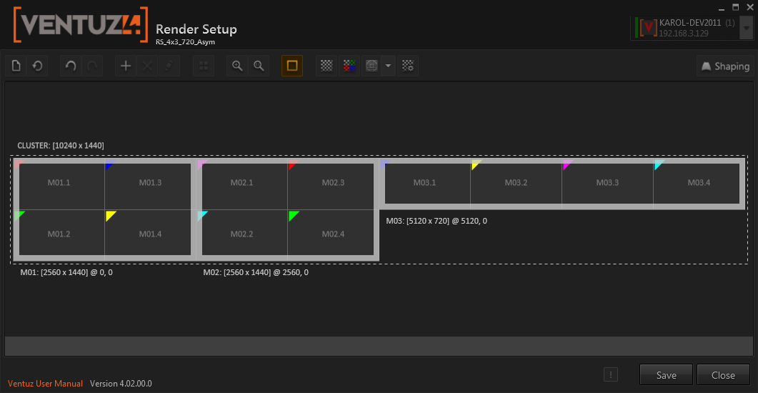 The Render Setup Editor is part of the Ventuz Configuration and is used to create an XML configuration for complex display walls. The content for such display walls may come from a single or from multiple Ventuz machines.