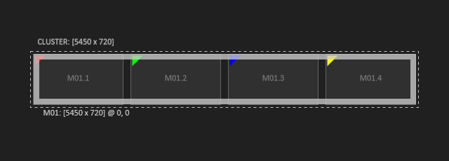 The dashed frame marks the visual border of the whole Cluster or Render Setup respectively. On top of this frame the visual resolution of the Cluster is displayed. (The Cluster always has the default name CLUSTER.)