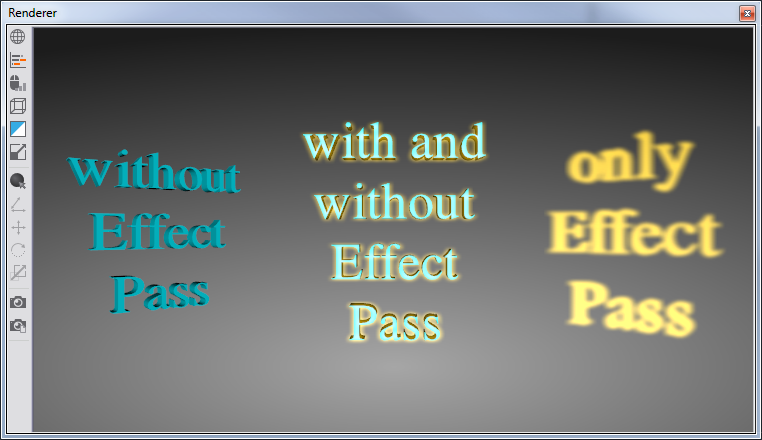 In the screen-shot below a glow effect was assigned to text objects. The glow is rendered in a separate render pass. Depending on the settings of the Filter Pass node only text, only glow or both, text and glow, are rendered.