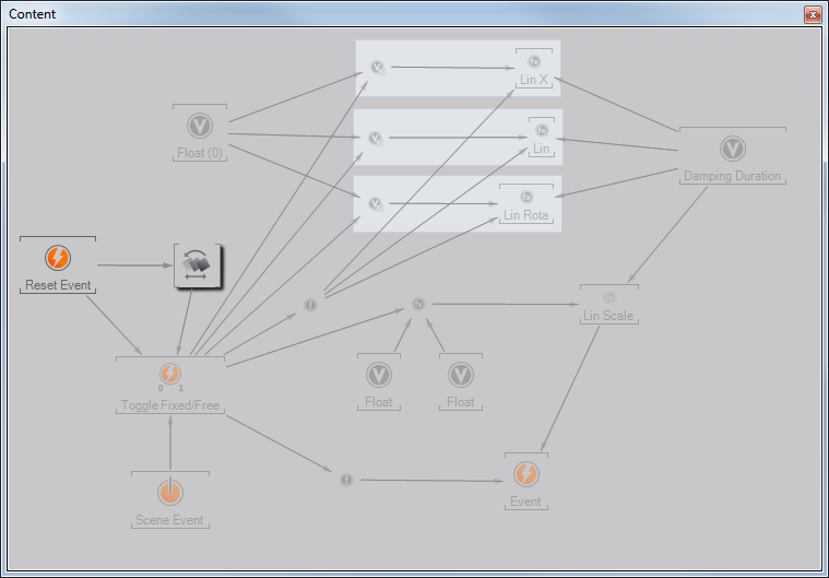 Bindings are visualized as arrows which connect nodes in the Content Editor. To create a binding, select a node, go to the Properties Editor and drag the input property onto another node. When released, Ventuz will open up a list of compatible output properties of that second node. Upon choosing one of the properties, a connection is created and visualized by an arrow going from the output node to the input node. For more information, see Property Editor.